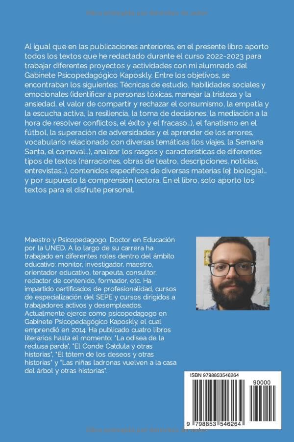 Como cada año, he vuelto a publicar un libro recopilando todos los textos que he redactado para trabajar diferentes contenidos, habilidades, destrezas y actitudes con mi alumnado. Solo he incluido los textos en sí, no las actividades. Son textos literarios que he utilizado para trabajar contenidos como los siguientes: Técnicas de estudio, habilidades sociales y emocionales (identificar a personas tóxicas, manejar la tristeza y la ansiedad, el valor de compartir y rechazar el consumismo, la empatía y la escucha activa, la resiliencia, la toma de decisiones, la mediación a la hora de resolver conflictos, el éxito y el fracaso…), el fanatismo en el fútbol, la superación de adversidades y el aprender de los errores, vocabulario relacionado con diversas temáticas (los viajes, la Semana Santa, el carnaval…), analizar los rasgos y características de diferentes tipos de textos (narraciones, obras de teatro, descripciones, noticias, entrevistas…), contenidos específicos de diversas materias (ej: biología)…y por supuesto la comprensión lectora.